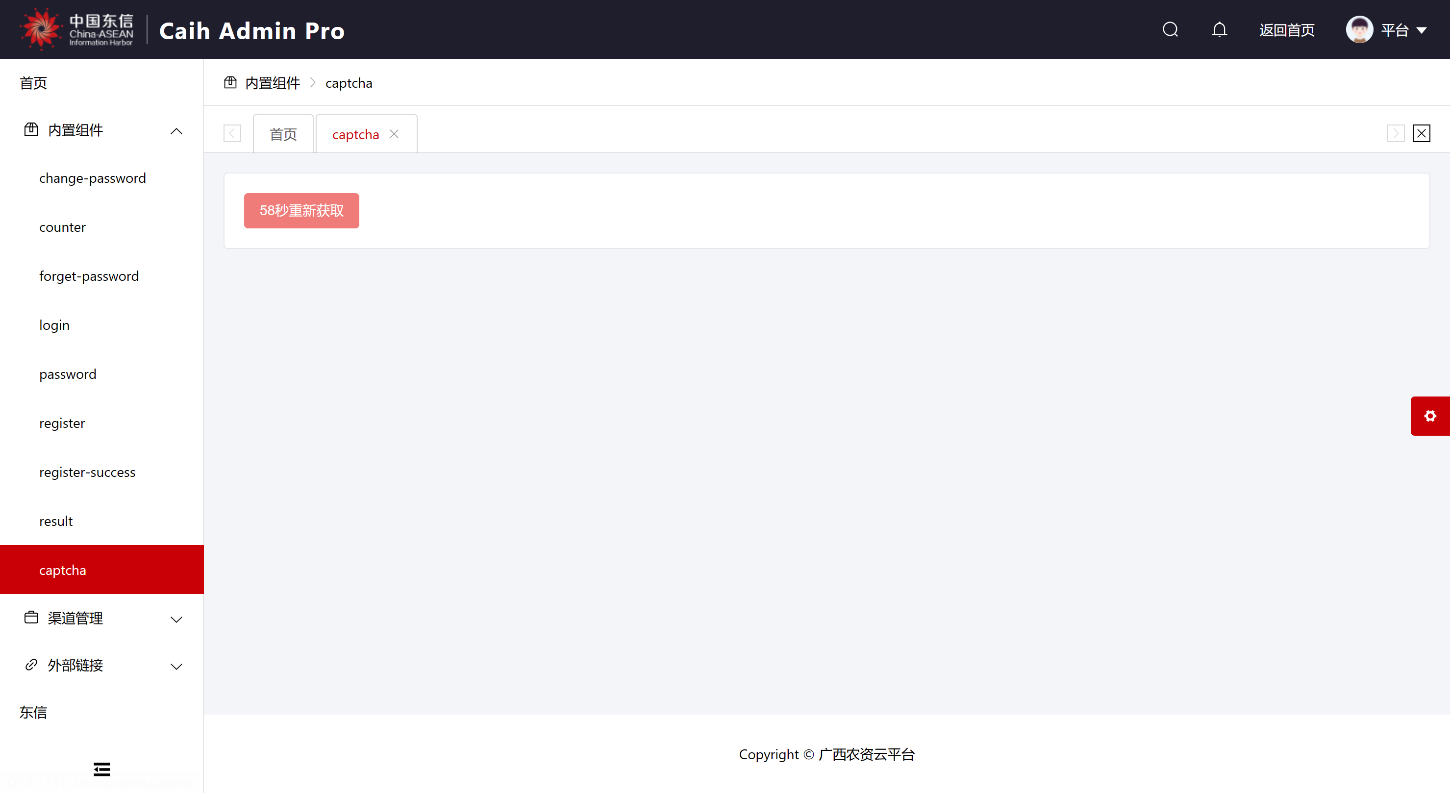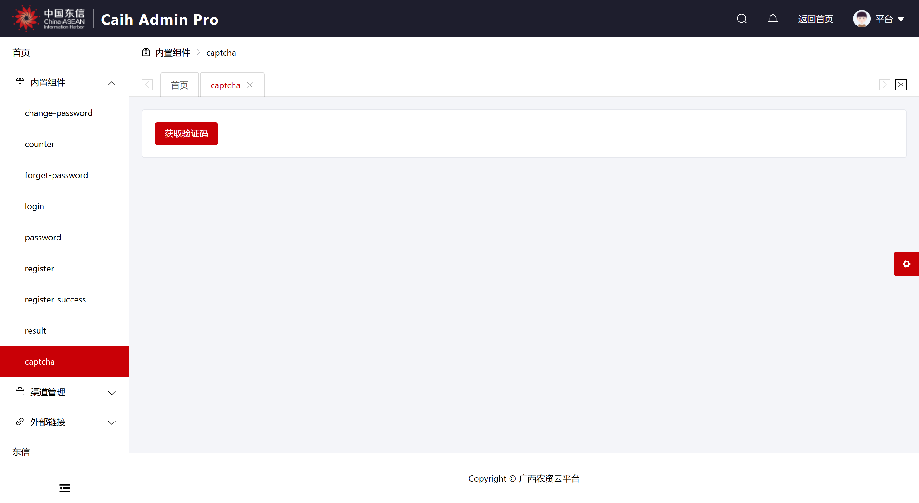 组件内部有内置的提示语,如获取验证码前的提示语为"获取验证码",用户可以通过参数配置自定义的提示: